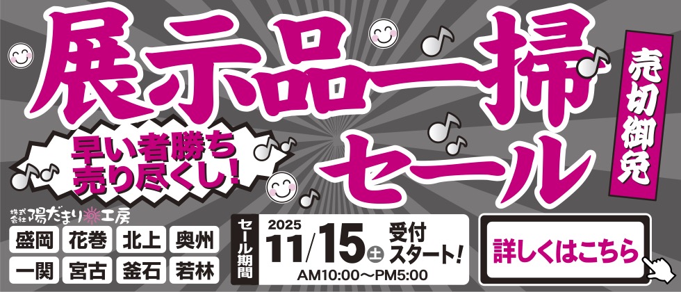 陽だまり工房の【展示品一掃セール】は、陽だまり工房全ショールームで2025年11月15日(土)10:00より開催いたします。お申込み方法は来店にて(事前予約不可)お受けいたします。15日・16日に限り、同一商品のお申し込みが重複した場合は、抽選とさせていただきます。17日以降に当社からお電話にてご連絡させていただきますが、複数回お電話をしてもご連絡が取れない場合はキャンセルとさせていただきますので、ご了承ください。
