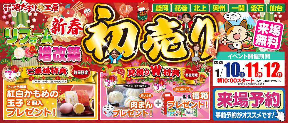 陽だまり工房の「大感謝セール」では、キッチン・お風呂・洗面台・トイレのリフォーム、まとめるとお得な「水廻り4点パック」や、小工事、断熱リフォームなどの、様々なプランをご提案しております。岩手県・宮城県でリフォーム・増改築をご検討されている方は、ぜひお近くの陽だまり工房へ一度ご相談ください。初めてリフォームする方、他社で見積もり中の方も歓迎いたします。お見積もりのご依頼・お問い合わせは、お電話・WEB・ご来店にて承ります。ショールーム見学だけでもOKです!お待ちしております!