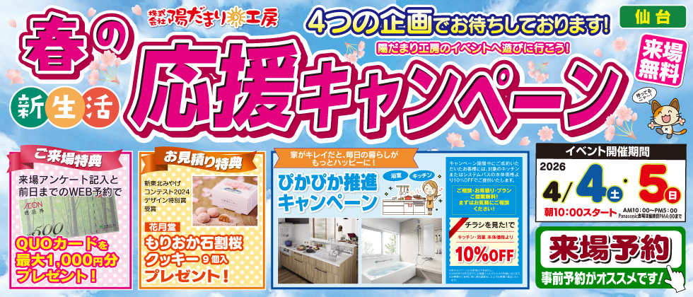 宮城県仙台市近郊にお住まいのリフォーム検討中の皆様へ! 陽だまり工房より「外壁・屋根塗装 新生活応援キャンペーン」のご案内です。ご自宅の外壁の劣化や屋根の色褪せ、お家周りの設備、室内の寒さなどにお悩みではないですか?そのような方に向けて陽だまり工房では、新生活のスタートも快適に!お得な塗装リフォームプランと省エネリフォームプランのご提案をいたします。エクステリアのお悩みも、お気軽にお問い合わせください。