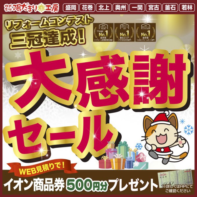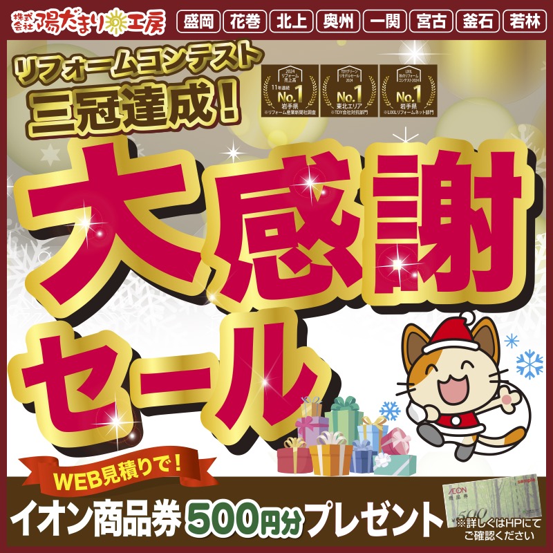 陽だまり工房の「大感謝セール」では、キッチン・お風呂・洗面台・トイレのリフォーム、まとめるとお得な「水廻り4点パック」や、小工事、断熱リフォームなどの、様々なプランをご提案しております。岩手県・宮城県でリフォーム・増改築をご検討されている方は、ぜひお近くの陽だまり工房へ一度ご相談ください。初めてリフォームする方、他社で見積もり中の方も歓迎いたします。お見積もりのご依頼・お問い合わせは、お電話・WEB・ご来店にて承ります。ショールーム見学だけでもOKです!お待ちしております!