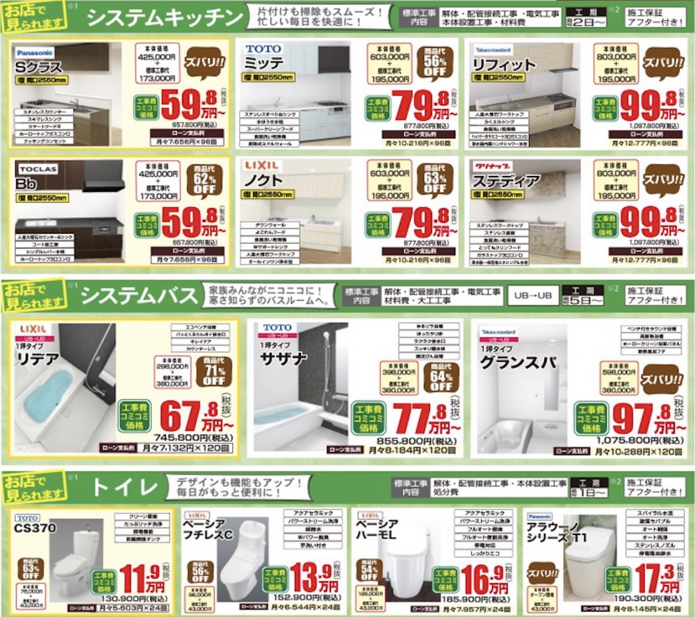 例えば、チラシ裏面では古くなったIHクッキングヒーターの交換やこれからの寒さ対策に欠かせないエアコンの交換など、今なら特別価格でご提供いたします。「どこに頼めばいいかわからない」「まずは相談だけしてみたい」そんな方も大歓迎です!その他にも、お客様のライフスタイルに合わせた最適なご提案をいたします。