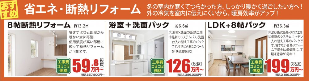 省エネ効果の高い断熱リフォームをお得に実現するチャンスです!「寒さや暑さが気になる」「光熱費が高すぎる…」とお悩みの方必見!建て替えをしなくてもひと部屋から断熱できるリフォームがございます。8帖断熱リフォームは、使用頻度が高いお部屋に絞って断熱リフォームが可能で税抜59.8万円からご案内しております。さらに、浴室+洗面パックなど、生活に必要なスペースを暖かい快適環境にできるプランも!お客様のお悩みやご要望を伺った上で最適なプランをご提案させていただきます!