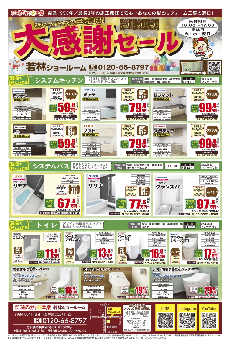 宮城県仙台市近郊にお住まいのリフォーム検討中の皆様へ! 「大感謝セール」のご案内です。ご自宅の水廻りの古さ・使いづらさなどにお悩みではないですか?そのような方に向けて陽だまり工房ではお得な水廻りリフォームプランのご提案をいたします。断熱のお悩みや小さなお悩みも、お気軽にお問い合わせください。