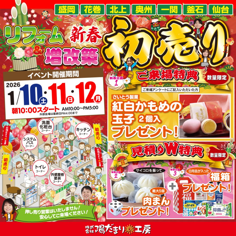 2026年1月10日(土)、11日(日)、12日(月・祝)の3日間にわたり陽だまり工房のリフォーム&増改築 新春初売りを開催いたします。