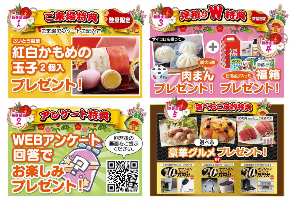 2026年にちなんだ特別価格のお年玉セールを今年も実施します!来場アンケートご記入で紅白かもめの玉子を、見積もり依頼いただくと肉まん&福箱を、さらに期間中のご成約で選べるグルメor最大30万円分のオプションプレゼントなどもご用意しました!年に一度のお得にリフォームできるチャンスです!