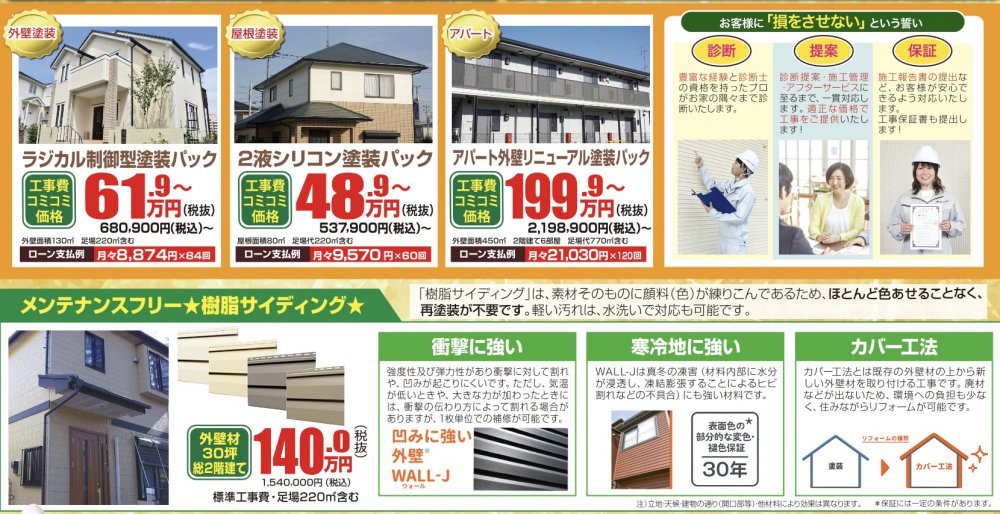 チラシ表面では、おすすめの塗装プランをご紹介しています。掲載内容は一例のため、ご希望に応じて個別のお見積もり・プランのご提案も可能です。現地調査・ご相談・お見積もりはすべて無料ですので、お客様のお悩みをお聞かせください!