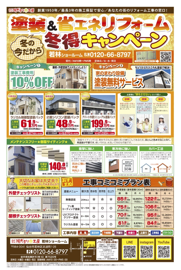 陽だまり工房の「塗装&省エネリフォーム 冬得キャンペーン」では、外壁・屋根塗装リフォームやキッチン・お風呂・内窓・玄関・給湯器の工事など、様々なプランをご提案しております。岩手県・宮城県でリフォーム・増改築をご検討されている方は、ぜひお近くの陽だまり工房へ一度ご相談ください。初めてリフォームする方、他社で見積もり中の方も歓迎いたします。お見積もりのご依頼・お問い合わせは、お電話・WEB・ご来店にて承ります。ショールーム見学だけでもOKです!お待ちしております!