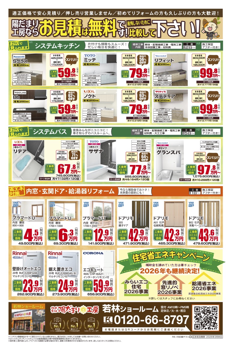 チラシ裏面では、冷暖房効率アップや結露対策にも効果的な内窓リフォームは税抜4.6万円から、見た目も一新できる玄関ドアの交換は最短1日の工事で税抜42.3万円から!省エネタイプの給湯器への交換も、今なら特別価格でご提供いたします。