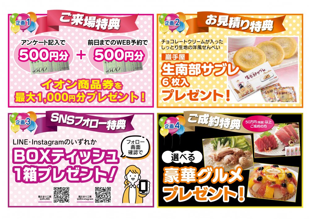 今回は、大決算特別企画として1,000万円リフォームパックを800万円でご提供します!また、ご来場いただいた方には、アンケートご記入で商品券500円分、前日までのWEB予約でさらに500円分の最大1,000円分プレゼント!見積もり依頼いただくと巖手屋「生南部サブレ」を、期間中のご成約で選べる豪華グルメなどもご用意しました!年に一度のお得にリフォームできるチャンスです!