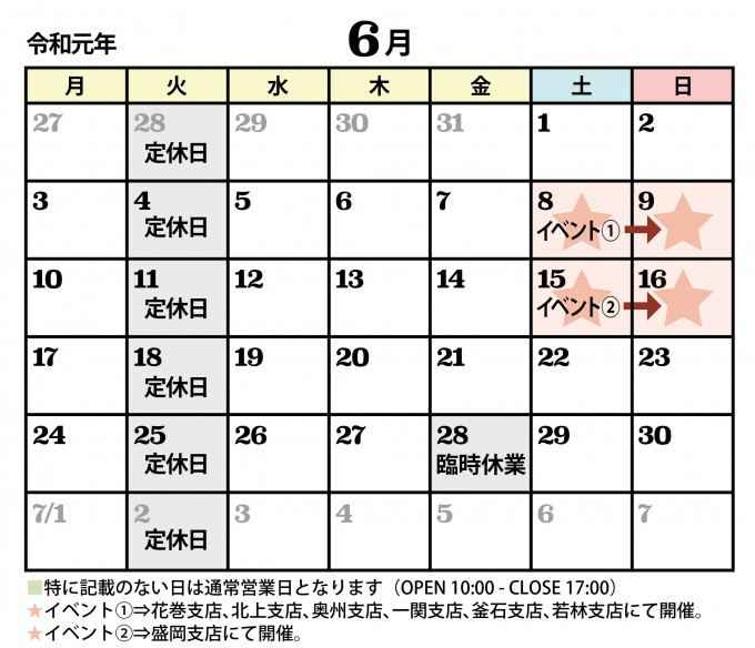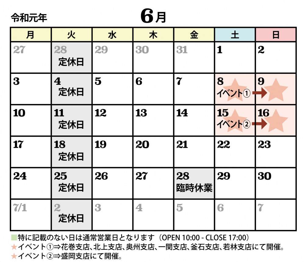 陽だまり工房ショールーム 2019年6月の営業カレンダーになります。