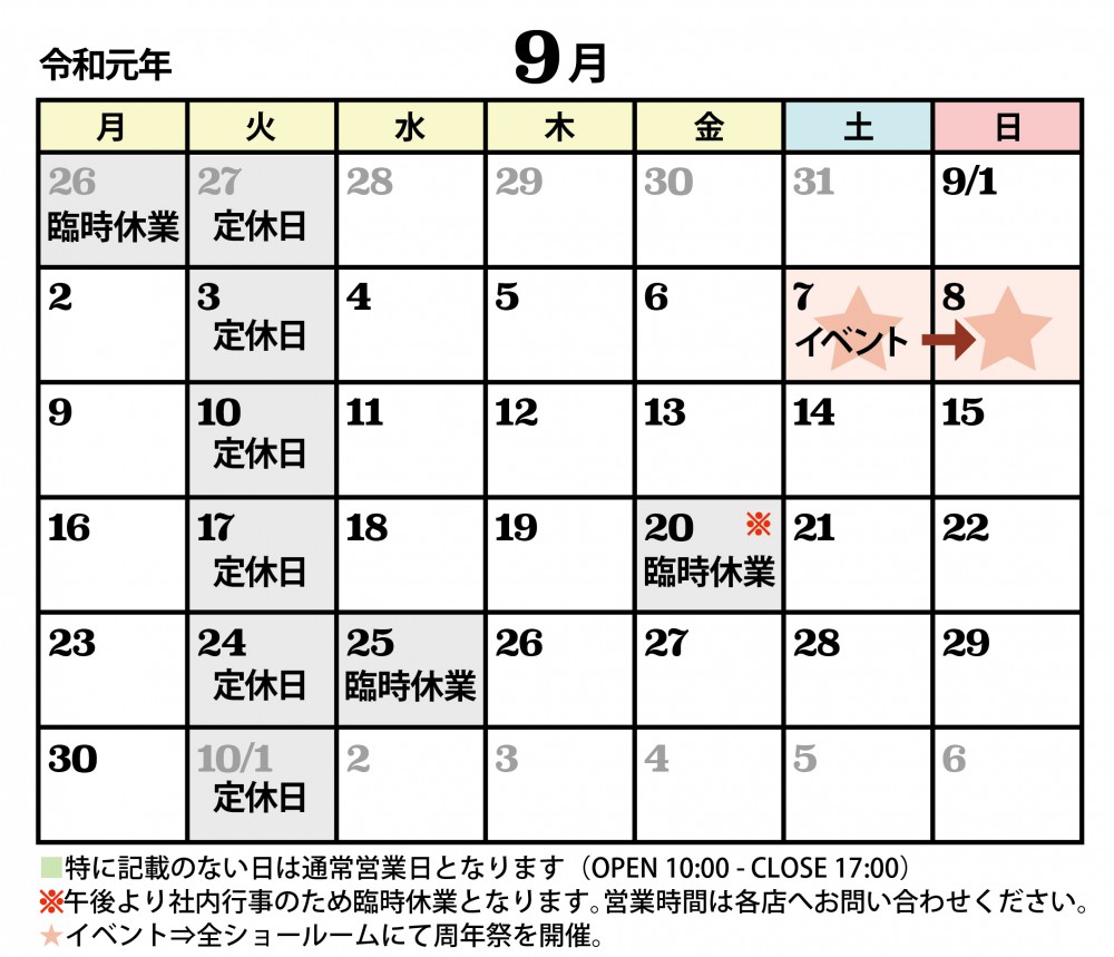 陽だまり工房ショールーム 2019年9月の営業カレンダーになります。