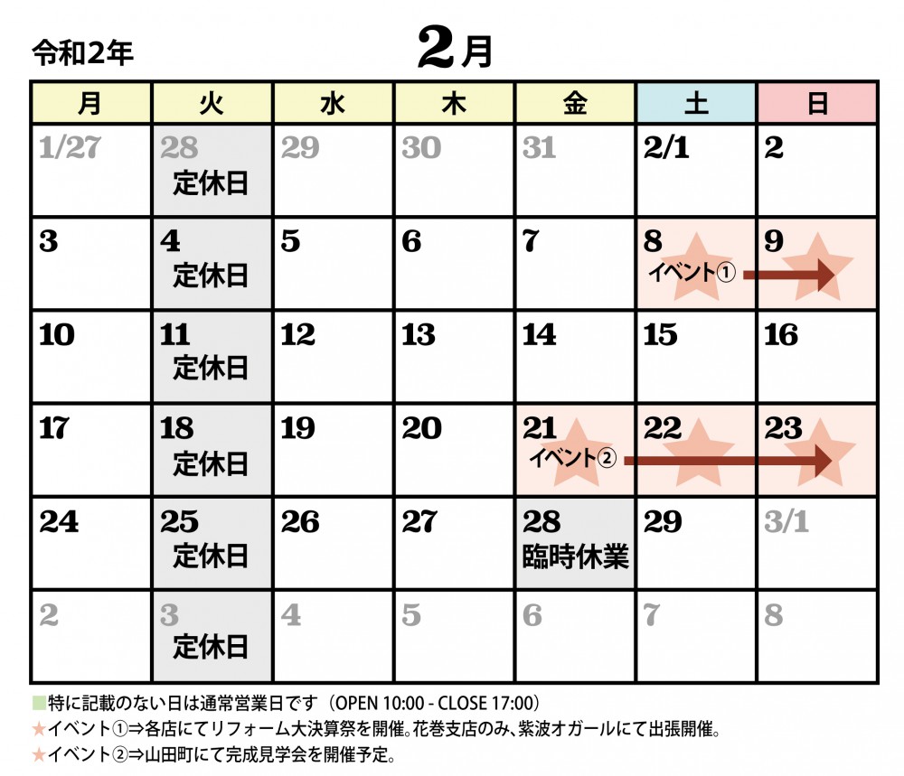 陽だまり工房ショールーム 2020年2月の営業カレンダーは以下の通りです。