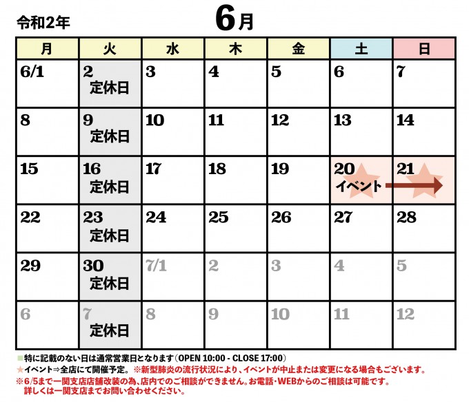陽だまり工房ショールーム 2020年6月の営業カレンダーは以下の通りです。
