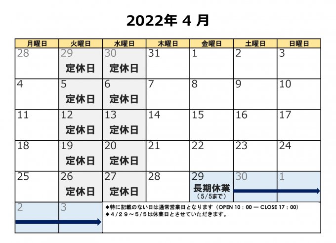 陽だまり工房ショールーム 2022年4月の営業カレンダーは以下の通りです。
