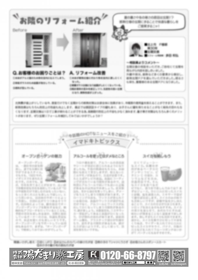 各支店の社員の日常やリフォーム紹介 暮らしに役立つ情報が盛りだくさんです。 ぜひご覧ください!