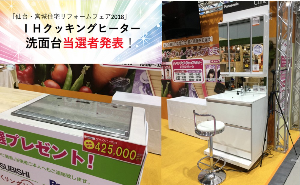 「抽選で各1名様に三菱IHクッキングヒーターまたはパナソニック洗面台ツインラインをプレゼント!!」の