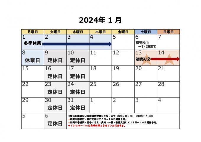 2024年1月の営業カレンダーは以下の通りです。