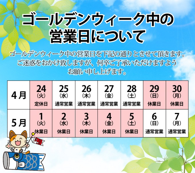 ゴールデンウィーク中の休業日程は、下記画像の通りです。