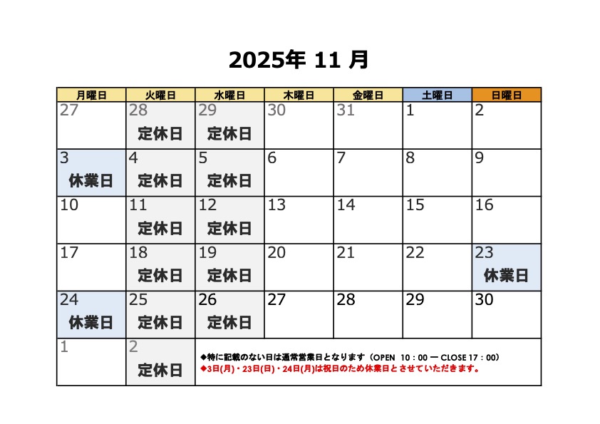 陽だまり工房ショールーム 2025年11月の営業カレンダーは以下の通りです。