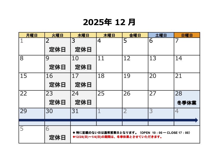 陽だまり工房ショールーム 2025年12月の営業カレンダーは以下の通りです。