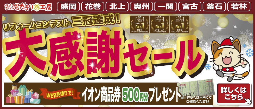 掲載期間12/5/(金)~1/31/(土)宮城県仙台市近郊にお住まいのリフォーム検討中の皆様へ! 「大感謝セール」のご案内です。ご自宅の水廻りの古さ・使いづらさなどにお悩みではないですか?そのような方に向けて陽だまり工房ではお得な水廻りリフォームプランのご提案をいたします。断熱のお悩みや小さなお悩みも、お気軽にお問い合わせください。 キッチン・お風呂・トイレ!水廻りリフォーム プラン紹介 キッチン、お風呂、トイレなど、毎日使う水廻りのリフォームは、家の印象を大きく変えるだけでなく、使い勝手や機能性も向上することができます。陽だまり工房では、様々な水廻り設備をお得に取り揃えております。キッチンは税抜59.8万円からご案内しております!さらにお風呂は税抜67.8万円からとお得に水廻りリフォームができます。キッチン・お風呂・トイレ・洗面台を組み合わせた「水廻り4点パック」もおすすめです!水廻り4点パックについてはチラシ裏面をご覧ください。 新しい設備を導入することで、掃除が楽になったり、光熱費を節約できたり、家事の負担が軽減されますよ!ライフスタイルに合わせたリフォームをご提案させていただきます! 快適な空間を手に入れる!お得な断熱リフォーム 省エネ効果の高い断熱リフォームをお得に実現するチャンスです!「寒さや暑さが気になる」「光熱費が高すぎる…」とお悩みの方必見!建て替えをしなくてもひと部屋から断熱できるリフォームがございます。8帖断熱リフォームは、使用頻度が高いお部屋に絞って断熱リフォームが可能で税抜59.8万円からご案内しております。さらに、浴室+洗面パックなど、生活に必要なスペースを暖かい快適環境にできるプランも!お客様のお悩みやご要望を伺った上で最適なプランをご提案させていただきます! また、陽だまり工房では無料で断熱診断を行なっております。気になるお部屋を専用の機器で測定・ヒアリングし、1週間程度で断熱診断報告書をお渡しいたします。寒さの原因や改善できるポイントを一緒に見つけてみませんか?気になる方は、陽だまり工房お問い合わせフォームより「断熱点検希望」とご意見欄にお書き添えください。未来の快適な暮らしをサポートさせていただきますので、お気軽にお申し込みください! >>無料「陽だまり断熱診断」お申し込みはこちら 【小工事】小さなお困りごともお任せください! 日々の暮らしをもっと快適に!陽だまり工房に小工事もお任せください!「ちょっと不便だな」「そろそろ交換したいな」そんなお悩みを解決いたします。IHコンロ・水栓・エアコンなど、暮らしの中で気になる“小さなリフォーム”も、お得に&手軽に実現できるチャンスです。 例えば、チラシ裏面では古くなったIHクッキングヒーターの交換やこれからの寒さ対策に欠かせないエアコンの交換など、今なら特別価格でご提供いたします。「どこに頼めばいいかわからない」「まずは相談だけしてみたい」そんな方も大歓迎です!その他にも、お客様のライフスタイルに合わせた最適なご提案をいたします。 住まいの困った20000件解決!施工事例のご紹介 陽だまり工房がこれまでに解決した実際の施工事例をご紹介します。HPでは2000件以上の施工事例を閲覧することができます。また、陽だまり工房の公式YouTubeではビフォーアフター動画もご紹介しています。ぜひご覧ください。 >>陽だまり工房の手がけた施工事例 >>陽だまり工房公式YouTube それぞれの企画の詳細や取り扱い商品はチラシをご覧ください。 チラシの画像をクリックすると鮮明な画像(PDF)で見られます。 チラシ情報まとめ 陽だまり工房の「大感謝セール」では、キッチン・お風呂・洗面台・トイレのリフォーム、まとめるとお得な「水廻り4点パック」や、小工事、断熱リフォームなどの、様々なプランをご提案しております。岩手県・宮城県でリフォーム・増改築をご検討されている方は、ぜひお近くの陽だまり工房へ一度ご相談ください。初めてリフォームする方、他社で見積もり中の方も歓迎いたします。お見積もりのご依頼・お問い合わせは、お電話・WEB・ご来店にて承ります。ショールーム見学だけでもOKです!お待ちしております! リフォームコンテスト三冠達成!「大感謝セール」 ◼︎日程 2025年12月5日(金)〜1月31日(土) ※火水祝日は除く ※冬季休業日 12/28(日)〜1/4(日) ◼︎会場 陽だまり工房 若林ショールーム ◼︎お問い合わせ 陽だまり工房 若林ショールーム 陽だまり工房は、岩手県奥州市にて創業1953年、工事実績20000件超!お客様一人ひとりのための 「オーダーメイドのリフォーム」が 当社のコンセプトです。押し売り営業などは致しませんので安心してご依頼ください。 WEB特典のご案内 WEBからのご来場予約で500円分のイオン商品券プレゼント!さらに、ご来店時にお見積もり依頼でさらに+500円分、合計で最大1000円分のイオン商品券プレゼント! ※税抜10万円未満のお見積りの場合は申し訳ございませんがお見積もり特典は対象外となり