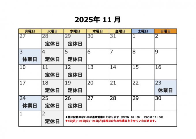 ★11/3(月)・23(日)・24(月)は祝日のため休業日となります。詳しくは支店へお問い合わせください。